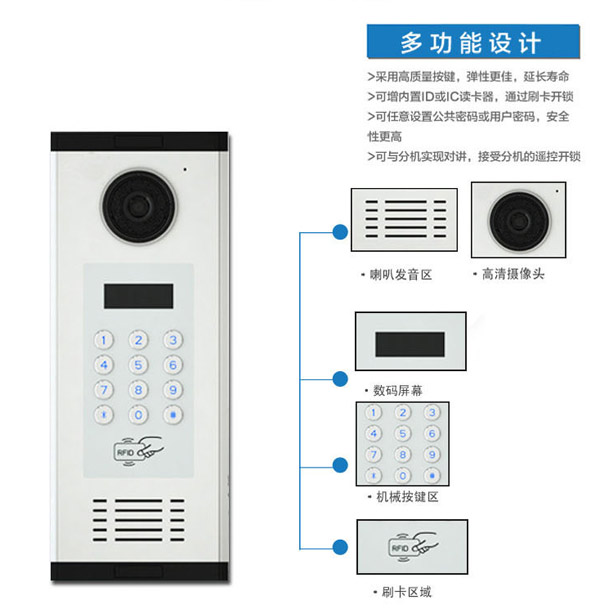 內(nèi)置CCD高清攝像頭,可設(shè)置密碼開鎖,上電與斷電兩種開鎖方式可選,鑲門或嵌墻安裝